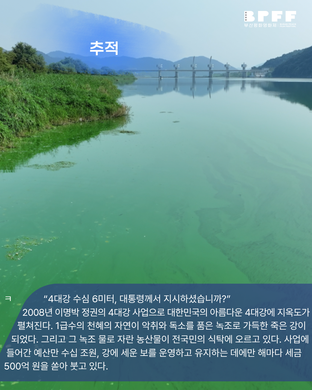 2008년 이명박 정권의 4대강 사업으로 대한민국의 아름다운 4대강에 지옥도가 펼쳐진다. 1급수의 천혜의 자연이 악취와 독소를 품은 녹조로 가득한 죽은 강이 되었다. 그리고 그 녹조 물로 자란 농산물이 전국민의 식탁에 오르고 있다. 사업에 들어간 예산만 수십 조원, 강에 세운 보를 운영하고 유지하는 데에만 해마다 세금 500억 원을 쏟아 붓고 있다. 대운하를 4대강 사업으로 둔갑시킨 정부의 거짓말과, 언론의 외면이 만들어낸 국토 파괴 프로젝트. 이 모든 결과는 우리 다음 세대들이 떠안게 될 것이다. 그와 공범자들의 악행을 17년 동안 추적해왔다. 처음에는 이명박의 말이 의심스러워서, 나중에는 녹조로 뒤덮인 강을 보고 참을 수 없어서, 그리고 이제는 우리 아이들이 이 강에서 살아갈 미래가 두려워서, 우리 후손들이 다시 강의 물길을 따라 마음껏 뛰놀 수 있도록— 이번에는 반드시, 이 문제를 해결해야 한다. 대한민국의 강을 다시 흐르게 해야 한다.